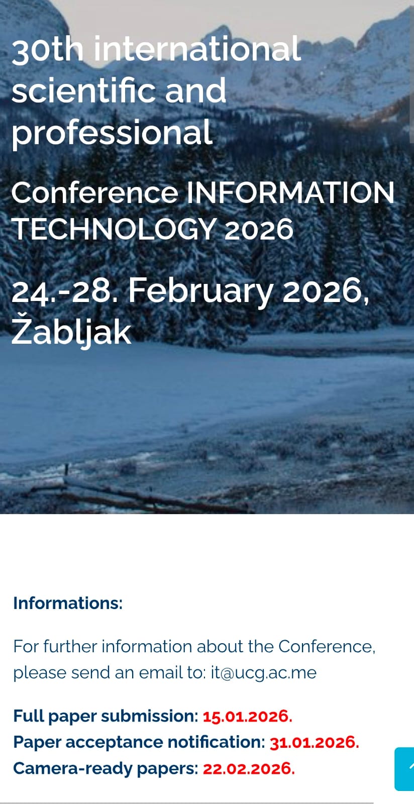 The jubilee 30th International Conference INFORMATION TECHNOLOGIES 2026 will be held from 24 to 28 February 2026 in Podgorica and Žabljak. The ceremonial academy on the occasion of the jubilee will be held in Podgorica on 24 February, and the working part of the conference will take place from 25 to 28 February in Žabljak. The Conference will feature lectures and round-table discussions on trends in the development of information and communication technologies worldwide, as well as current events in this field in Montenegro. In agreement with the Conference Organizing Committee, interested institutions may organize presentations of their scientific-research, professional, development, and production projects and achievements.
