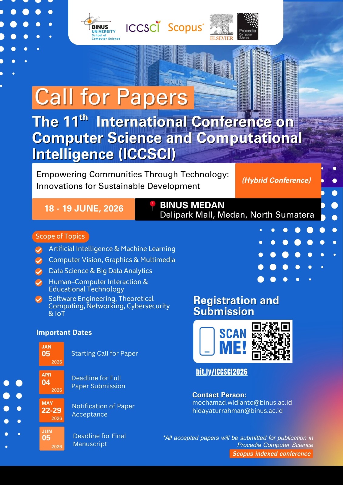 The 11th International Conference on Computer Science and Computational Intelligence (ICCSCI) is back! Bina Nusantara University invites researchers, academicians, and professionals to contribute to the ICCSCI. The theme of ICCSCI 2026 is “Empowering Communities Through Technology: Innovations for Sustainable Development”.